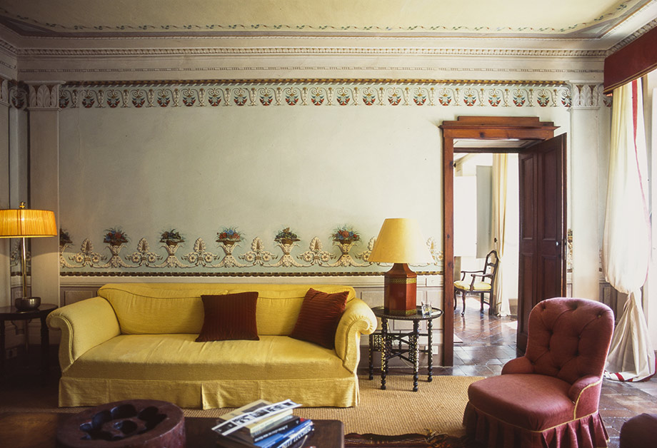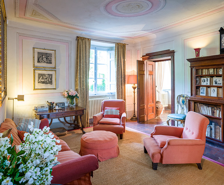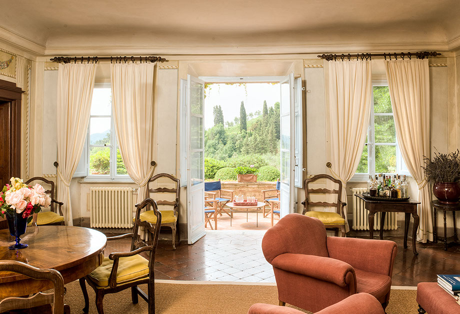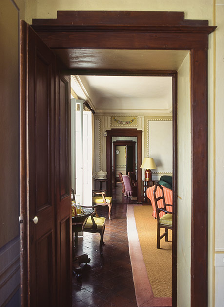 Entrance hall, central living room with French windows into a terrace.